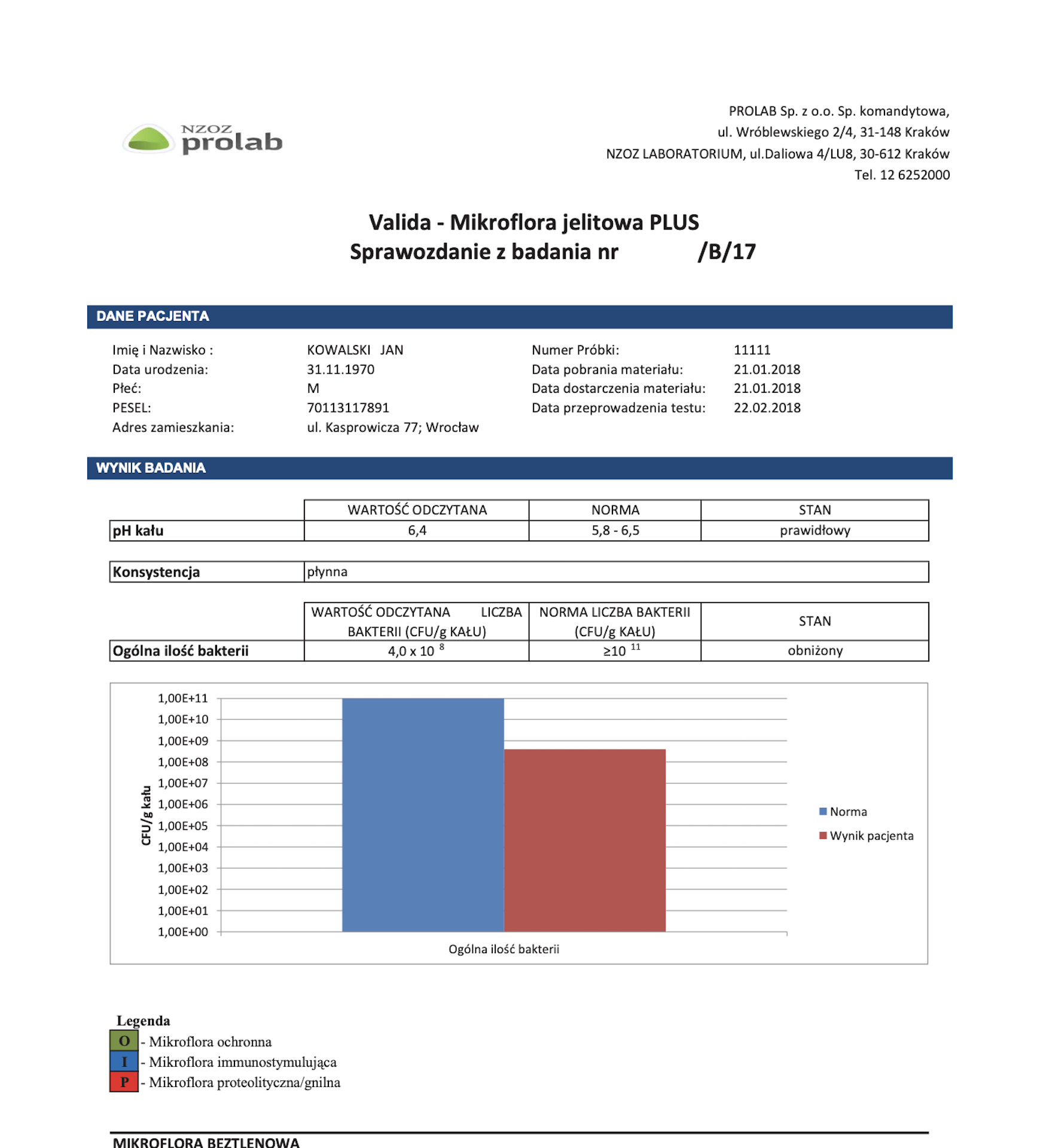 Podgląd na to, jak wygląda wynik badania mikroflory jelitowej w Santelab. Pamiętaj, że specyficzne wyniki mogą się różnić.